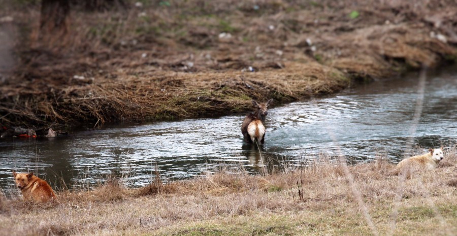 Na naše prekvapenie sa onedlho na mieste objavili muži zákona, privolaní zrejme miestnymi obyvateľmi. Podarilo sa im odplašiť psov, avšak jelenica bola vystresovaná a bála sa vyjsť z vody. Skúšali ju vyplašiť, ale maximálne ju dokázali dostať o pár metrov nižšie po rieke. Bála sa vyjsť na breh, za ktorým nasledovala rozľahlá lúka pod lesom a niekde ukryté predátory.